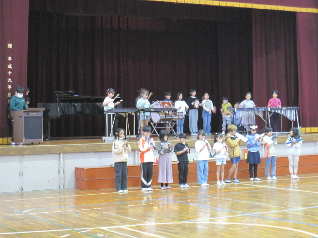 3年生は「パフ」の合奏を披露しました。「パフ」はアメリカ発祥の童謡で、竜と少年ジャッキーの友情を描いたファンタジーソングです。リコーダーの練習曲ですが、「いろいろな楽器を使って合奏をしてみたい」という子どもたちの願いから、担任が合奏曲にアレンジしたそうです。寸劇を交え、2年生のときから一気にグレードアップした発表でした。