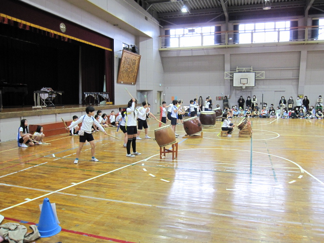 4年生は和太鼓の演奏を披露しました。4年生は35人います。太鼓は長胴太鼓4つと、締太鼓3つの計7つしかありません。どのように演奏したかというと、締太鼓の3人は固定し、32人で4つの長胴太鼓を代わる代わる叩いたり、複数人で叩いたりしました。後半につれてリズムを速くし、合いの手(掛け声)も大きくなり、圧巻の演奏でした。