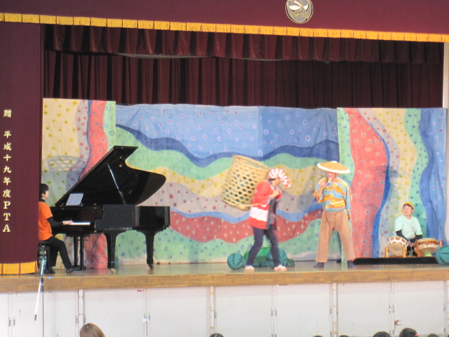 今年の芸術鑑賞会は、「オペレッタ劇団ともしび」の方々をお招きしました。リズム遊びからはじまり、「ごんべえかかし」というオペレッタを鑑賞しました。話が進んでいくにつれて、子どもたちはどんどん前のめりになり、「おじいさんだまされないで~。」「すいか泥棒はすぐそこにいるよ~。」と演者に大きな声を掛けていました。この様子を劇団の方もとても喜んでいられました。まな小の子どもたちの、純粋さや素朴さを再確認できたひと時でした。