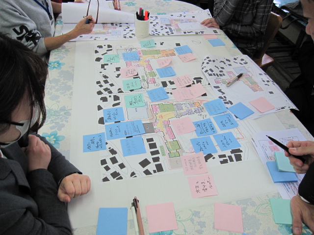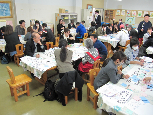 新しい学校づくりに向けて中学校の先生に小学校に来てもらい、小中合同ワークショップを行いました。各グループ、小中の先生が混ざり、図面を見ながら意見を出し合いました。中学校の先生方の意見がとても新鮮に聞こえました。新しい学校ができる前に、来年の9月には中学校が移ってきます。小中の先生方の交流も進めていきます。