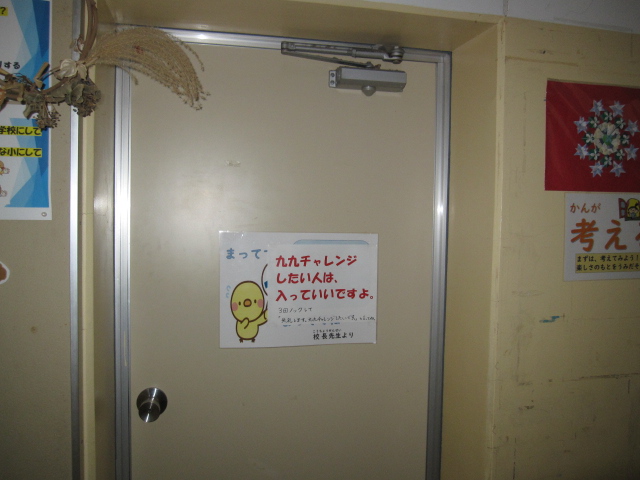 子どもたちが九九を正確に唱えられるようにということで、学校全体で取組を始めました。。時間は休み時間で強制ではありません。というわけで校長室入り口に写真のような張り紙をしたところ、たくさんの子どもたちがチャレンジに来ました。九九は2年生での学習です。しっかり身に付いていないと、3年生のわり算や、4年生以降の算数、中学生になってからの数学に大きな支障をきたします。現時点で九九が怪しい子どもたちは、この取組でできるようになることを願っています。