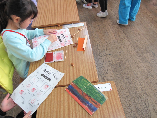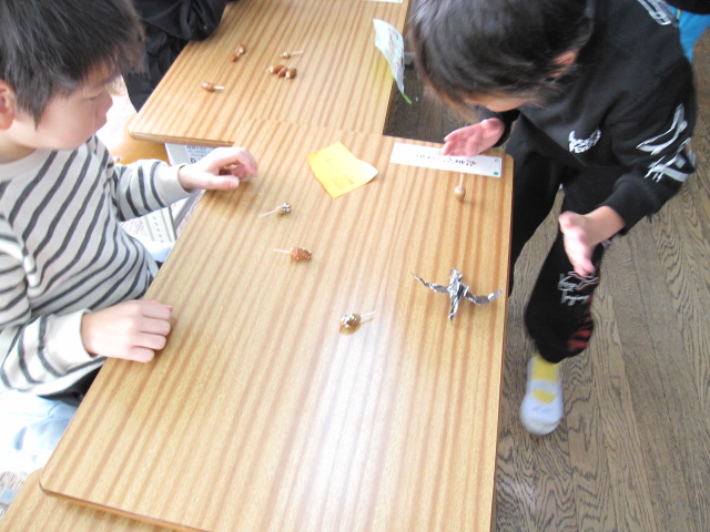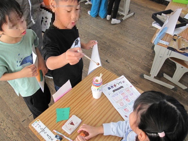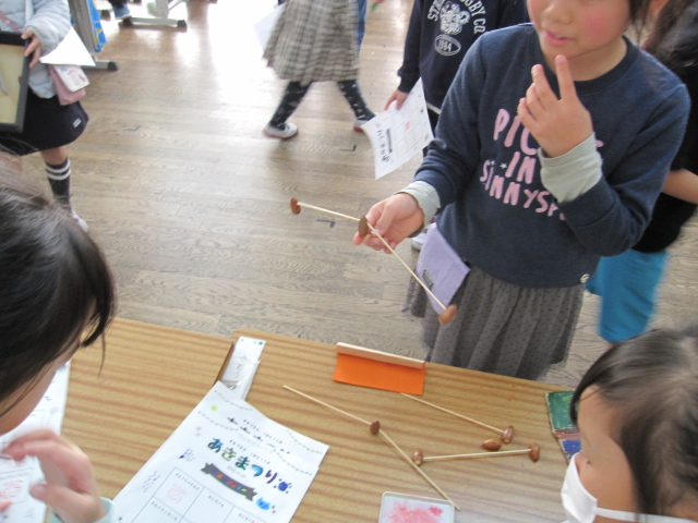 1年生から「あきまつり」の招待を受けました。ドングリを使ったおもちゃ(やじろべえ、こま、けんだま、ころころ迷路、マラカス)を作り、順番で店番と遊ぶ人とで分かれるシステムでした。やはり店番よりも遊ぶ方が人気でした。1年生、招待してくれてありがとう。