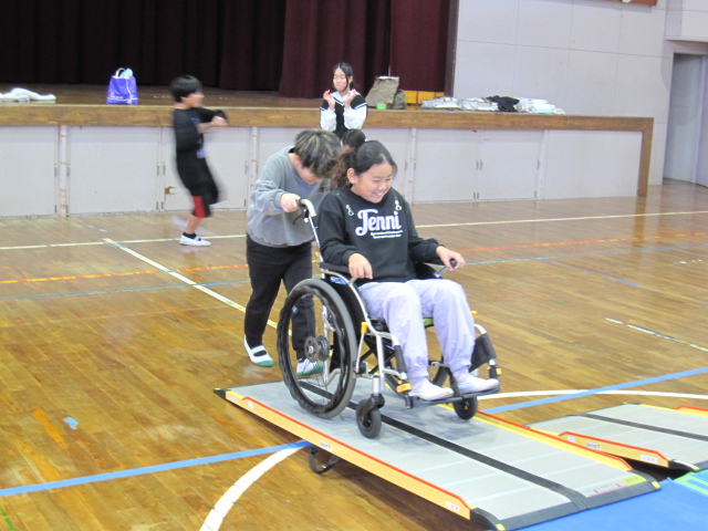出前授業では、4年生は福祉の学習の一環で車椅子バスケットボール体験をしました。