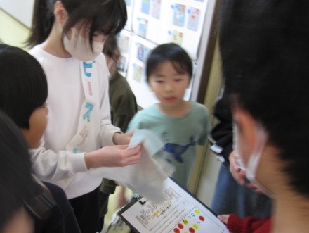 ・見つけたら「ハッピー20。」とみんなで声を出し、ハッピースターとジャンケンをして勝ったら一文字書いてあるシールをもらう。