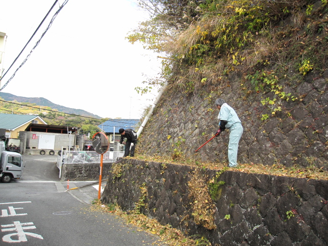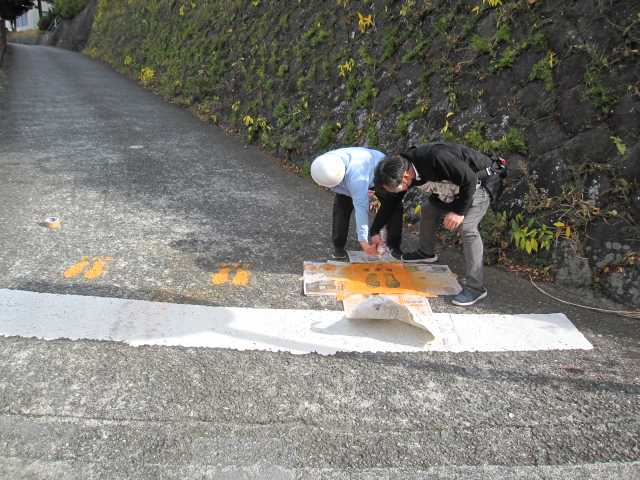 私たちが「足形・とまる マーク」を付けていたところ、同じ時間帯で、体育館の横(消防分署側)の石垣を教育委員会の4名方々がきれいにしてくださっていました。翌日には町長さんも加わってくださいました。ありがとうございました。