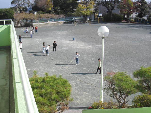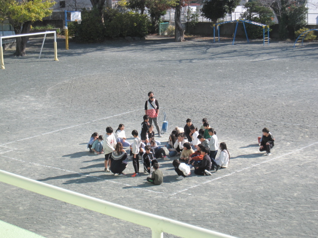 4年生の算数で「面積」の学習があります。今日はいろいろな面積の単位の学習です。担任は、1a(アール)や1ha(ヘクタール)などの大きな面積の単位は、数字だけでは実感させることは難しいと考え、運動場に出て体感させていました。1ha(100m×100m)は運動場では確保できない、1a(10m×10m)はクラス全員がちょうど入る大きさ など、子どもたちは体験を通して理解できたようでした。