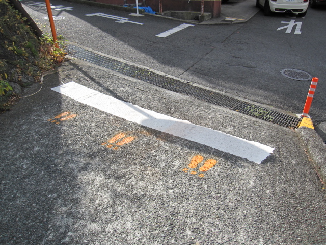 下校時、学校スロープを勢いよく駆け下りたり、いったん止まらずに交差点に飛び出たりする子どもが多いという情報が入りました。各学年での指導に加え、学校にあった「道路線引き用スプレー」を使って、停止線に沿って「足形マーク・とまる」を3つ付けました。私一人でやるつもりでしたが、ひまわり級の子どもと担任が手伝ってくれました。ありがとうございました。これからも、子どもたちの安全を守るために、学校でできることはやっていきます。