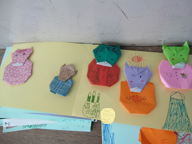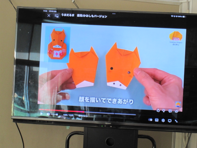 1年生の教室をのぞくと、折り紙を使って何かを作っています。先生がテレビに映し出していたものは、折り紙で作る「うまだるま」の作り方でした。私がのぞいたときは、まだ作り始だったので作品の全貌は分かりませんでしたが、再び教室に行ってみると、自分の好きな色の折り紙や模様を描いた、オリジナルの「うまだるま」がたくさんできていました。教室に飾られるのが楽しみですね。