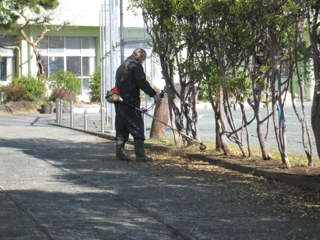 12月11日に女性の用務員さんの働きを紹介しましたが、今日はもう一人の男性の用務員さんの働きを紹介します。 男性の用務員さんは、主に校舎周りの環境整備を担当してくださっています。この日は草刈り機を使って雑草を刈ってくださいました。チェーンソーで枝を落としてくださる日もあります。