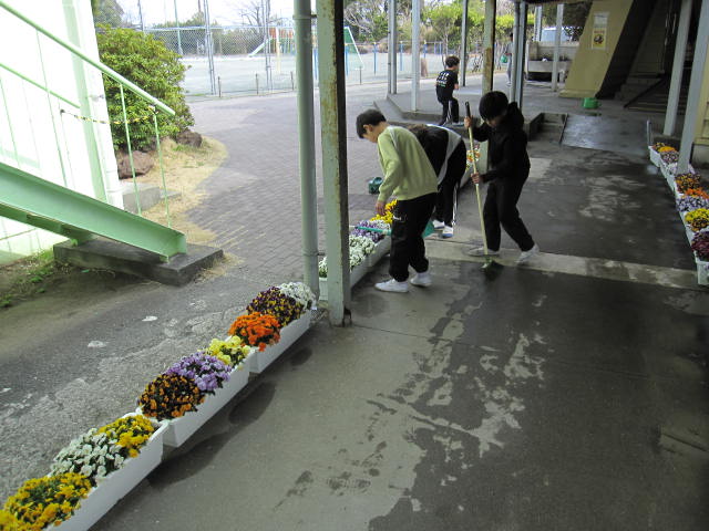 5校時に5年生が卒業式前日の準備を行いました。6年生の靴箱から体育館までの廊下の掃除、体育館渡り廊下の花並べや式台の飾りつけなど、一人一人が役割をしっかりと果たし、丁寧に取り組んでいました。5年生のみなさん、ありがとうございました。これで明日の卒業式を気持ちよく迎える準備が整いました。