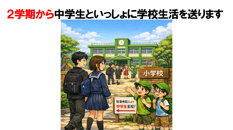 今日の修了式では、次年度の2学期から中学生といっしょに学校生活を行うことについて子どもたちに説明をしました。主な変更点としては、校舎内の使い方が変わり、1,2階が小学生エリア、3階が中学生エリアになることです。まずは、小中学生共に安心して学校生活を送ることができる環境を整えていきます。