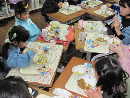 4月から1年生になる年長さんたちが給食体験を行いました。これまで園児交流を重ねてきた5年生といっしょに給食を食べ、和やかな時間を過ごしました。メニューはカレーライスとサラダ、3月3日ということもありひなあられのおまけつきでした。5年生に負けず劣らず、多くの園児のお皿がきれいになっていてサラダもほぼ完食でした。4月からは毎日おいしい給食が待っていますよ。